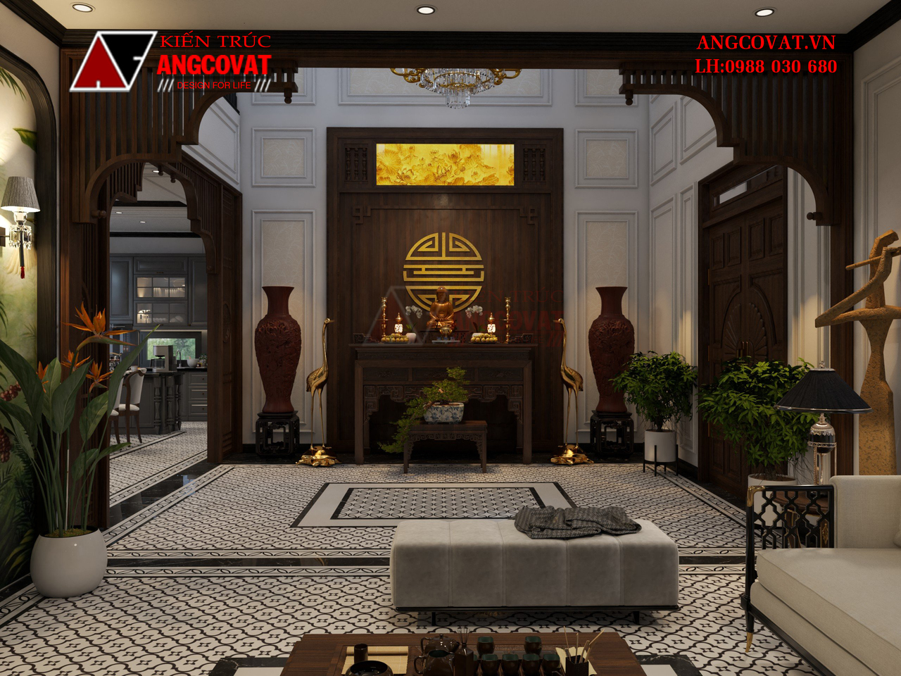 Như cách bố trí nhà 2 tầng 180m2 này gia chủ mong muốn đặt phòng thờ ngay tầng 1 thông với không gian phòng khách vừa tạo không gian mở vô cùng trang trọng, sạch sẽ.