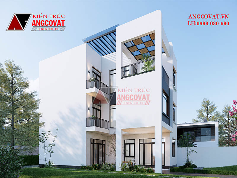 Mặt tiền nhà 3 tầng đẹp được dùng với những vật liệu kính khung gỗ , lan can bằng sắt hiện đại cộng với hệ thống đèn chiếu sáng hiện đại cho ngôi nhà. Màu trắng ngoại thất cộng với những mảng màu gỗ tự nhiên cho ngôi biệt thự mang phong cách hiện đại.