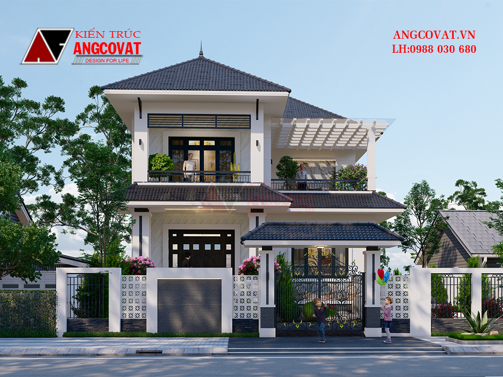 Mẫu nhà 2 tầng mặt tiền 9m sâu 16m được thiết kế trên mảnh đất vuông vức ở quê, kiến trúc mái nhật cân đối hài hòa, mặt bằng công năng 5 phòng ngủ 1 phòng thờ phù hợp nhu cầu nhiều gia đình có đông người.