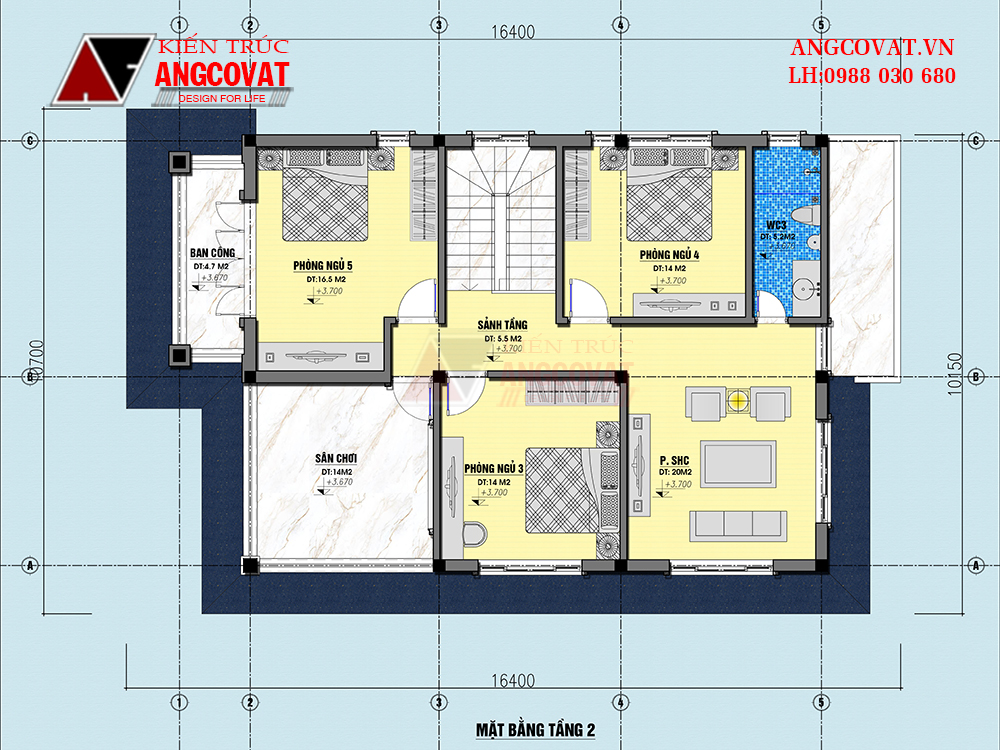 Mặt bằng công năng sử dụng nhà 9x16m 5 phòng ngủ phòng thờ tầng 2