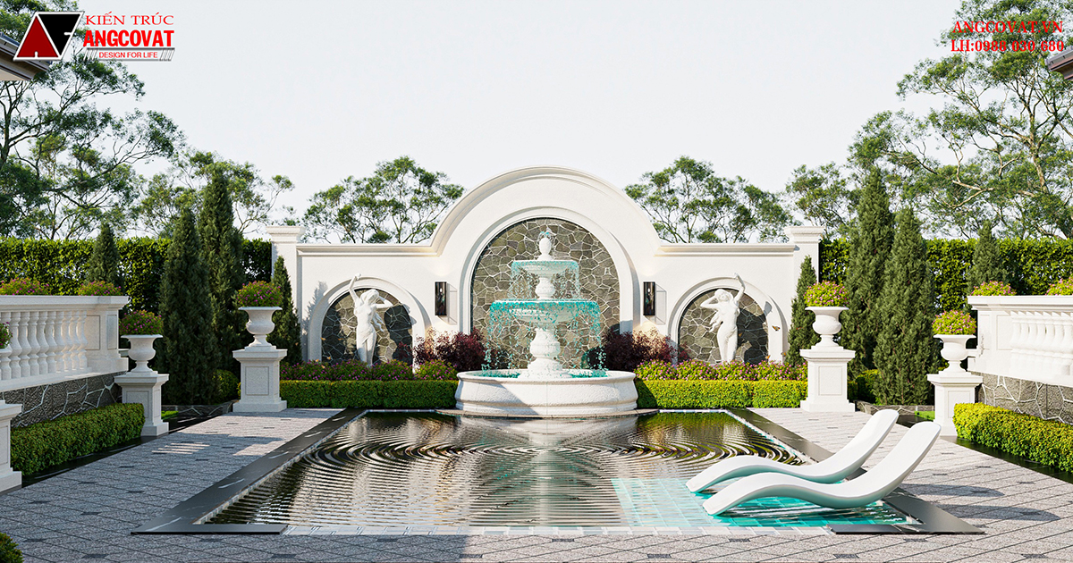 Vòi phun nước: Tượng đài nước bằng đá nhân tạo hoặc đá trắng nguyên khối (điểm nhấn phong cách Địa Trung Hải)
