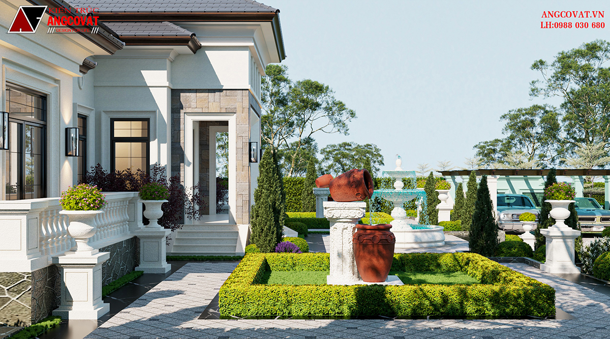 Sân vườn bao quanh, tích hợp lối đi dạo, cây xanh, thảm cỏ hoặc hồ cá
