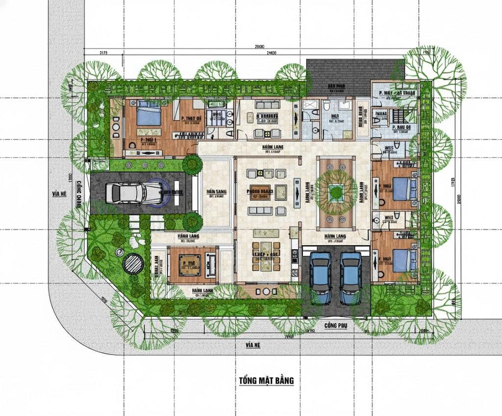Phòng khách: 30m² – đặt tại vị trí trung tâm, kết nối trực tiếp sân trong
