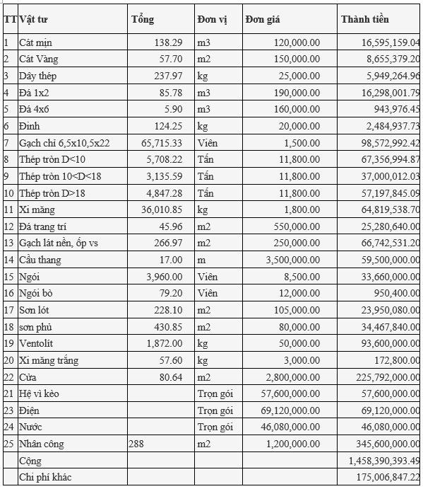 Các nguyên vật liệu, khối lượng và đơn giá của chúng đã được liệt kê rất chi tiết trong bảng chi phí dự tính. Khối lượng nguyên vật liệu trên thực tế có thể có thể tăng hoặc giảm so với sự tính toán ban đầu, do việc sử dụng cũng như bảo quản nguyên vật liệu trong quá trình thi công, vì vậy khâu giám sát công trình rất quan trọng để tránh sự lãng phí và thất thoát vật liệu xây dựng. Đơn giá vật tư cũng có sự giao động ở tại các địa phương khác nhau và thời điểm mua khác nhau. Chủ đầu tư nên nắm bắt tình hình giá cả có thể mua dự trữ các vật liệu để có thể tiết kiệm một khoản chi phí.