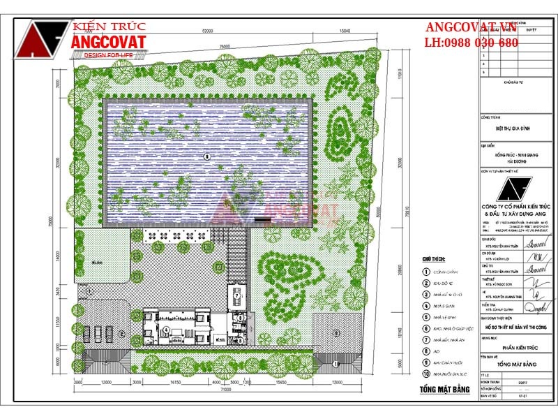 Khuôn viên lô đất rộng tới 80x77m - khá thoải mái để kiến trúc sư lên ý tưởng quy hoạch mặt bằng. Ngoài diện tích dành cho nhà chính và nhà thờ theo hình chữ L, khoảng sân rộng kết hợp ao cá hồ sen phía trước thì xung quanh sẽ là nơi trồng cây cối, vườn tược vừa tạo bóng mát vừa là cây ăn trái, rau sạch, cây cảnh,.. Không gian sống không ồn ã, khác xa với phố thị ồn ào nóng bức, chính là điều mà rất nhiều gia chủ ao ước có được.