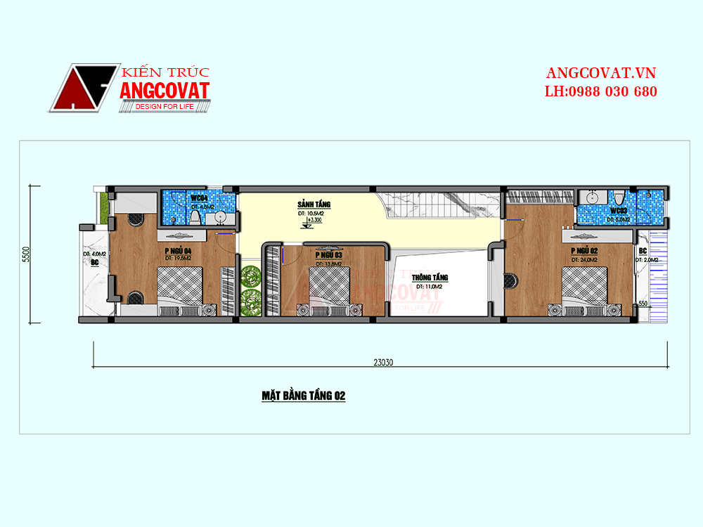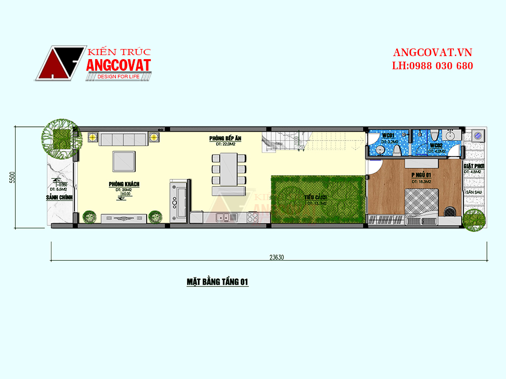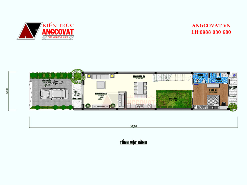 Mặt bằng tầng 1 nhà ống 2 tầng kích thước 5.5x23m
