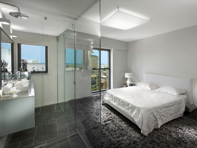 - Thiết kế nhà tắm trong phòng ngủ cần tránh để cửa phòng đối diện giường dễ gây hỗn loạn sinh khí, mang đến nhiều chuyện thị phi, rắc rối và bệnh tật cho gia đình.