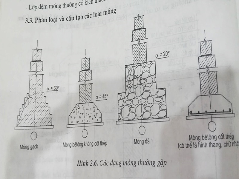 - Móng đá hộc là loại phổ biến dùng trong nhà dân dụng thấp tầng nhất là những nơi có nhiều đá. Do kích thước của đá không đều nhau cho nên bề dày của cổ móng > 400mm. Đối với móng cột bề dày của cổ móng > 600mm, chiều rộng giật bậc bằng chiều cao bậc giật (b/h = ½). Chiều cao bậc giật thường lấy 350 – 600mm