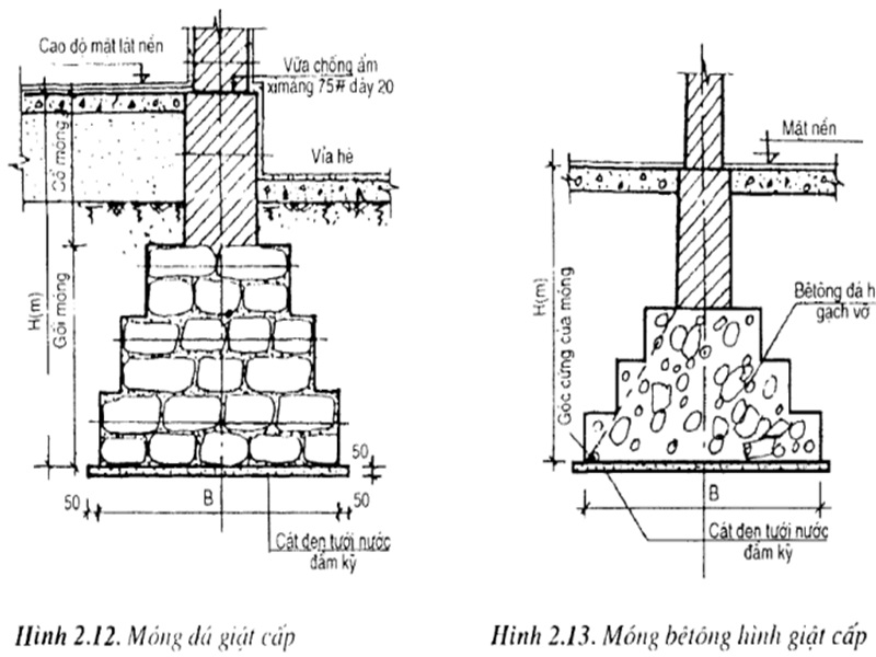 - Với móng có giật bậc, chiều cao mỗi bậc thường không nhỏ hơn 50 cm. Đá hộc dùng xây móng phải có cường độ 200 kg/cm2.