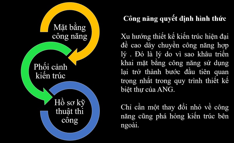 Chẳng phải ngẫu nhiên mà trong quy trình thiết kế nhà đẹp ANG, triển khai mặt bằng công năng lại trở thành khâu đầu tiên. Bước thực hiện này được cho là quan trọng bởi nó ảnh hưởng trực tiếp tới hình khối kiến trúc ngôi nhà. Công năng quyết định hình thức nhưng đồng thời công năng cũng là một trong ba bộ phận cấu thành nên kiến trúc (3 bộ phận cấu thành nên kiến trúc là công năng- yêu cầu tiện nghi; sự hoàn thiện kỹ thuật- điều kiện vật liệu, kết cấu, kỹ thuật xây dựng; hình tượng nghệ thuật- yêu cầu thẩm mỹ)