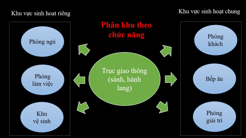 - Khu sinh hoạt hàng ngày: là các không gian phục vụ mục đích sinh hoạt chung, chấp nhận sự ồn ào, chủ yếu khai thác vào ban ngày. Nhóm không gian này bao gồm phòng khách, bếp, phòng ăn, tiền sảnh, hành lang, phòng sinh hoạt giải trí (karaoke, phòng gym,…), sân vườn, gara ô tô.