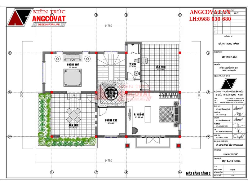 +) Tầng 3: Sảnh tầng 7.5m2, Phòng kho 8m2, Phòng ngủ 5: 29m2, Phòng thờ: 20m2, Sân phơi 18m2, Sân chơi: 20m2, WC4: 5m2.