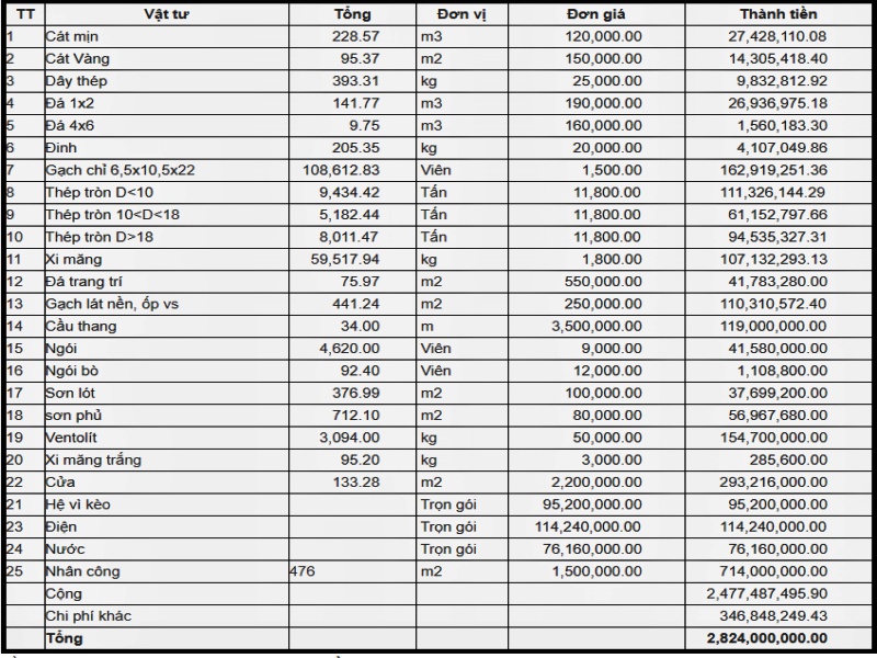 * Trường hợp chỉ làm vì kèo lợp ngói, đóng trần chi phí là: 2.541.600.000,00