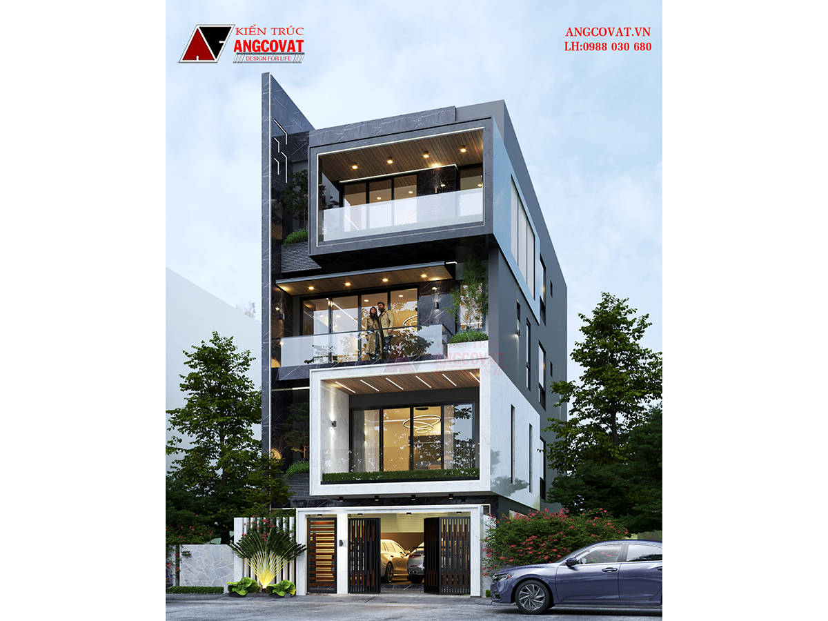 Công trình sử dụng hệ khung hình hộp khỏe khoắn, ốp đá granite đen, kết hợp kính cường lực và mảng tường trắng tinh tế, tạo nên tổng thể sang trọng và thời thượng.
