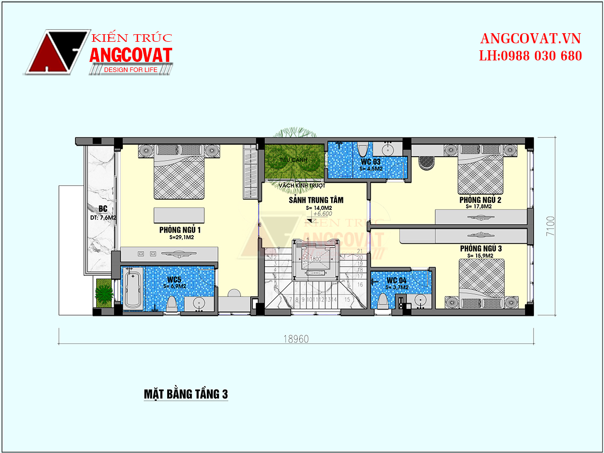 Gồm 3 phòng ngủ diện tích 29.1m², 17.8m² và 15.9m², cùng 2 WC riêng biệt.