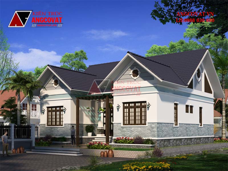 Phong cách truyền thống được tô đậm bằng mái ngói đỏ, tường vàng nhạt và hệ cửa màu nâu gỗ trong mẫu thiết kế nhà 2 phòng ngủ 1 phòng khách 150m2 BT109067