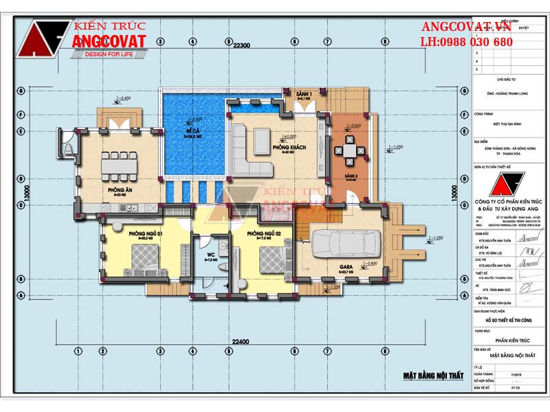 +) Tầng 1: Sảnh 5.1m2, Phòng khách 30m2, Sảnh 3: 10m2, Gara ô tô: 22,7m2, Phòng ăn: 23m2, Phòng ngủ 1; 20.5m2, Phòng ngủ 2: 17.5m2, WC: 7.5m2.