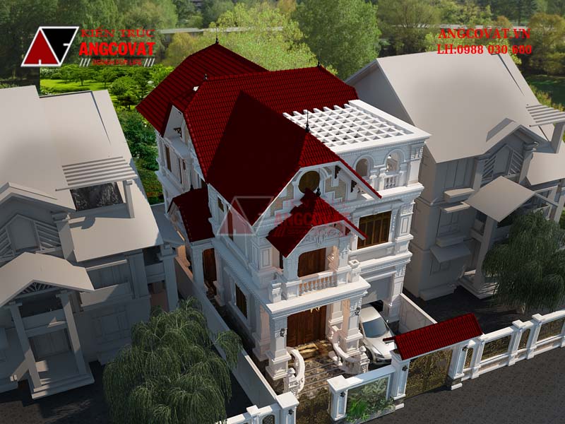 Điểm nhấn của mẫu nhà mật tiền 10m biệt thự cổ điển chính là hệ thống mái thái màu đỏ cam giúp ngôi nhà nổi bật trên nội thất màu sơn trắng. Sử dụng hệ thống mái thái lợp ngói giúp thuận thiện hơn cho việc xây dựng và thi công. Ngoài ra bạn cũng dễ dàng hơn trong cách tạo kiểu dáng, hình khối mái mang lại giá trị thẩm mĩ cao, tính sáng tạo cao hơn hẳn, bề thế hơn so với mái bằng hay mái tôn. Ở những công trình kiến trúc phong cách cổ điển tại Châu Âu trước đây thường sử dụng mái bằng nhưng ở Việt Nam kết hợp với mái thái là sự sáng tạo của kiến trúc sư để kết hợp vẻ đẹp gần gũi mái ngói với phong cách mới lạ của phương Tây tạo nên nét cuốn hút riêng cho các kiến trúc nhà mặt tiền 10m cổ điển.