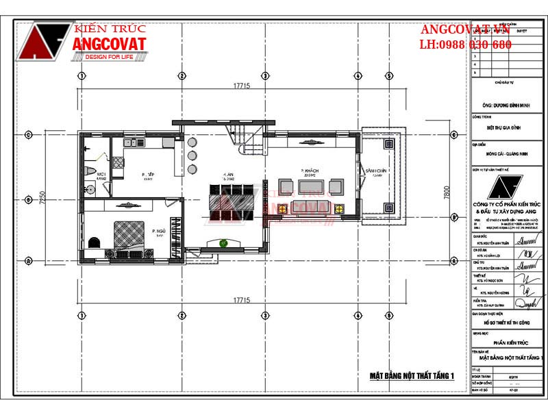 - Tầng 1: 1 phòng khách 20m2, 1 phòng bếp ăn 35m2, phòng ngủ 1 13m2, 1 phòng vệ sinh 4,5m2, gara 14,5m2, sảnh tầng 10m2, tiền sảnh 7,5m2