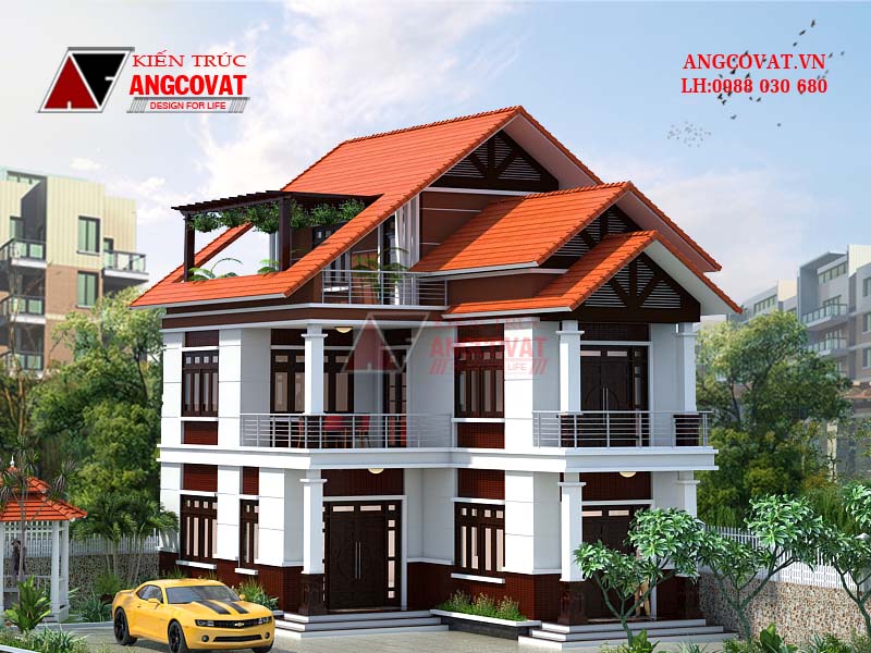 Mẫu số 11: Mẫu thiết kế nhà có gác lửng hiện đại 2 tầng diện tích 140m2 mái ngói đỏ đẹp mê mẩn BT101028