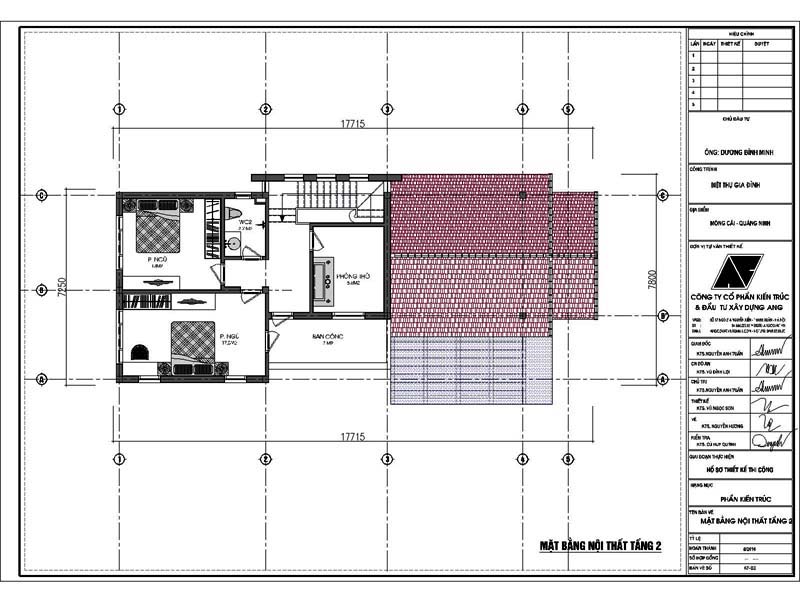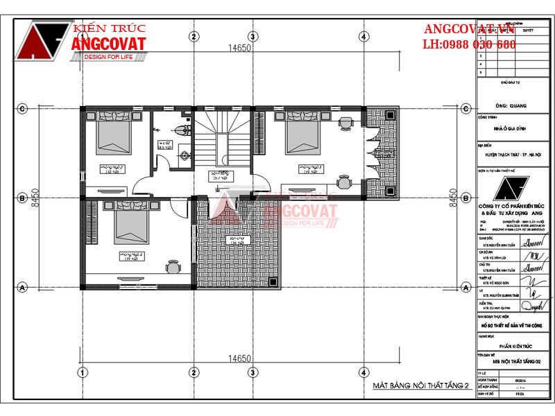 Nội thất tầng 2 nhà 2 5 tầng diện tích 100m2 mái thái thiết kế các phòng ngủ 1 (16.5m) ngủ 2 (16.5m2), phòng ngủ 3 (17m2), WC 2 (4m2) đều được thiết kế tập trung ở các góc tường tạo được sự kín đáo, và riêng tư. 2 phòng ngủ dành cho con cái của anh Tuấn được thiết kế với không gian mở ra bên ngoài với ban công đẹp mắt, thoáng đãng, là nơi có thể ngắm cảnh nhìn ra bên ngoài một cách tối đa nhất. Ở ban công, mở cửa đón gió và nắng vào phòng giúp thông thoáng và sạch sẽ không gian sẽ trở nên gắn bó thân thiết làm cho con cái đi đâu cũng nhớ về chiếc giường ngủ của mình.