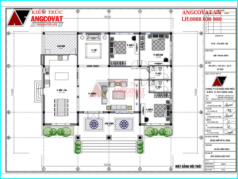 Phòng khách (28m2), phòng ngủ bố mẹ (16.5m2), phòng ngủ con 1 (15m2), phòng ngủ con 2 (12.8m2), tiền sảnh (10m2), phòng thờ (10m2), WC (3.8m2), phòng bếp + ăn (14.5m2)