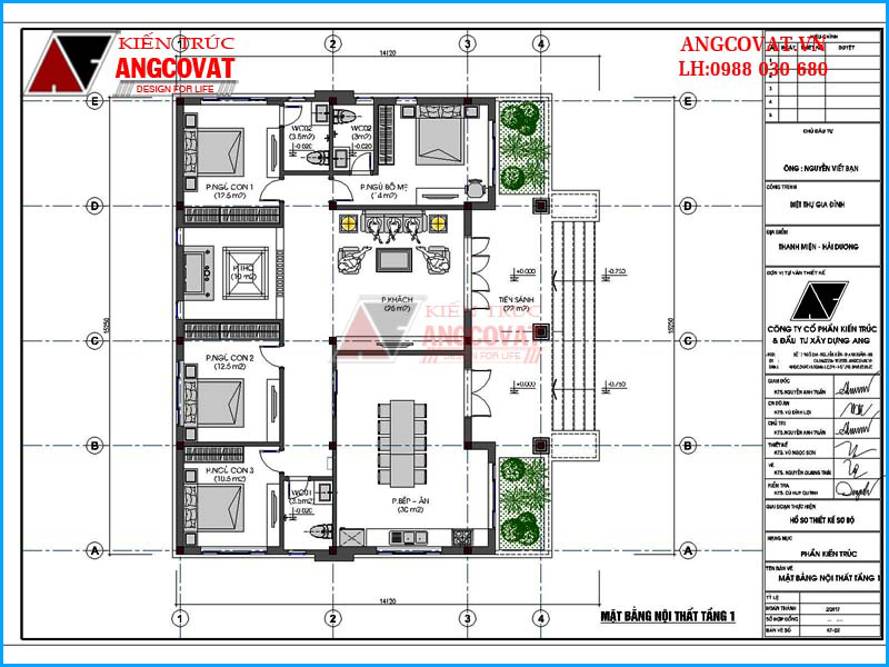 Công năng: 1 phòng khách 25m2, phòng bếp ăn 30m2, tiền sảnh 22m2, phòng thờ 10m2, phòng ngủ bố mẹ 14m2, phòng ngủ con 1 - 2: 12.5m2, phòng ngủ con 3: 10.5m2, wc1: 3.5m2, wc2: 3m2
