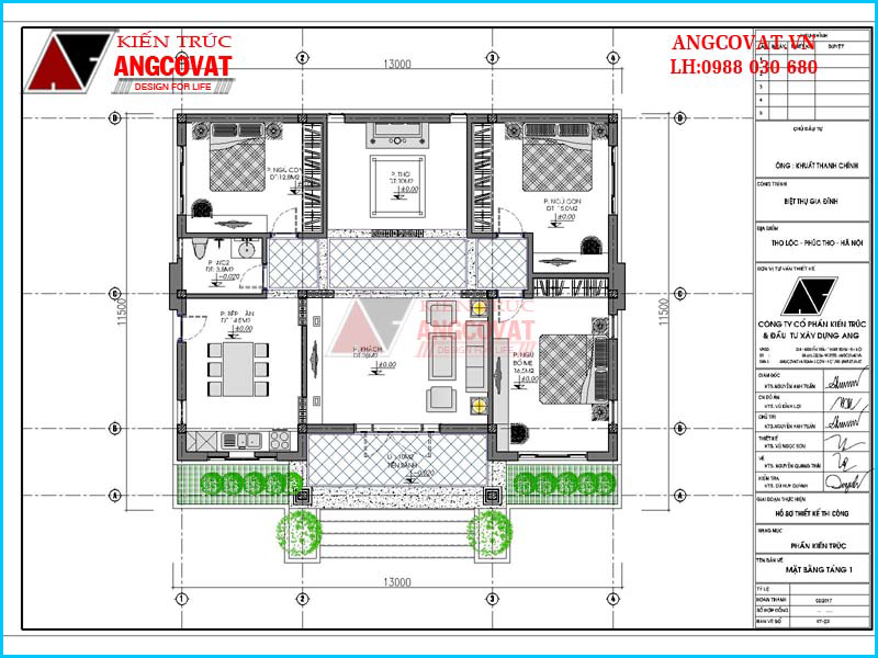 Thông số công năng: phòng khách 40m2; Phòng thờ: 12,5m2; Phòng ngủ 1: 10m2; Phòng ngủ 2: 13m2; Phòng ngủ 3: 14m2; Phòng bếp và ăn: 22m2; Phòng ngủ 4: 13m2; WC1: 3,3m2; WC2: 3,3m2; WC3: 3m2.