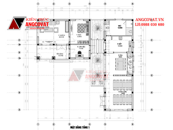 Nhìn vào mặt bằng công năng trong thiết kế nhà 1 tầng diện tích nhỏ bạn có thể thấy các không gian đều được bố trí nhỏ xinh. Khu tiền sảnh rộng 13m2, phòng khách rộng 22m2, phòng ngủ rộng 12m2, phòng làm việc rộng 7,4m2. Tất cả các không gian đó tuy nhỏ nhưng lại có sự thuận tiện trong di chuyển, hơn nữa từ nhà chính bạn có thể xuống nhà ăn thông qua lối di ở phòng làm việc.