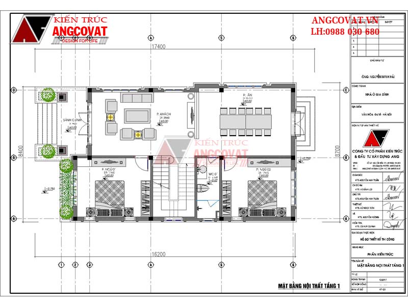 - Tầng 1: Tiền sảnh 9m2, phòng khách 25m2, phòng bếp + ăn 25m2, phòng ngủ 1 17mm2, WC1 5m2, phòng ngủ 2 17m2.