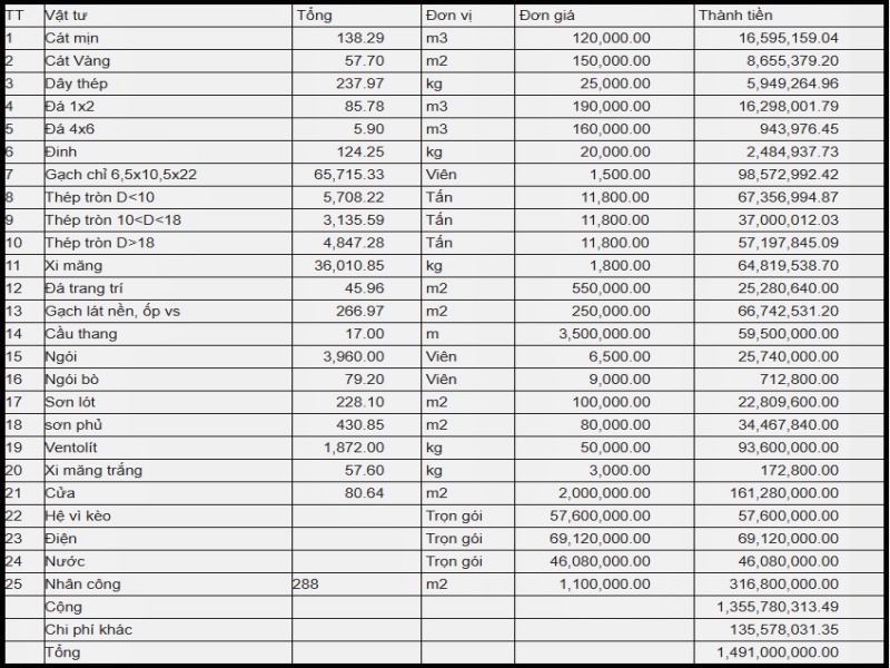 * Trường hợp chỉ làm vì kèo lợp ngói, đóng trần chi phí là: 1,341,900,000 đồng