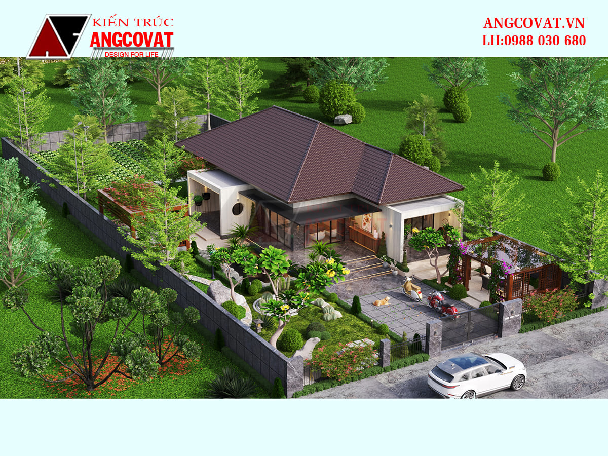 Bản vẽ phối cảnh 3D nhà cấp 4 mái nhật 180m2 có sân vườn hiện đại, chi phí hợp lý nhất để xây ở quê