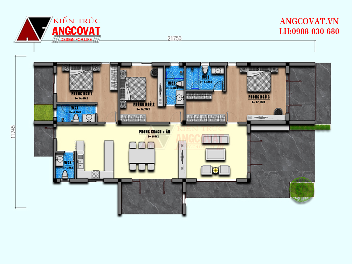 WC chung: 3m² – đặt gần phòng khách/ăn.